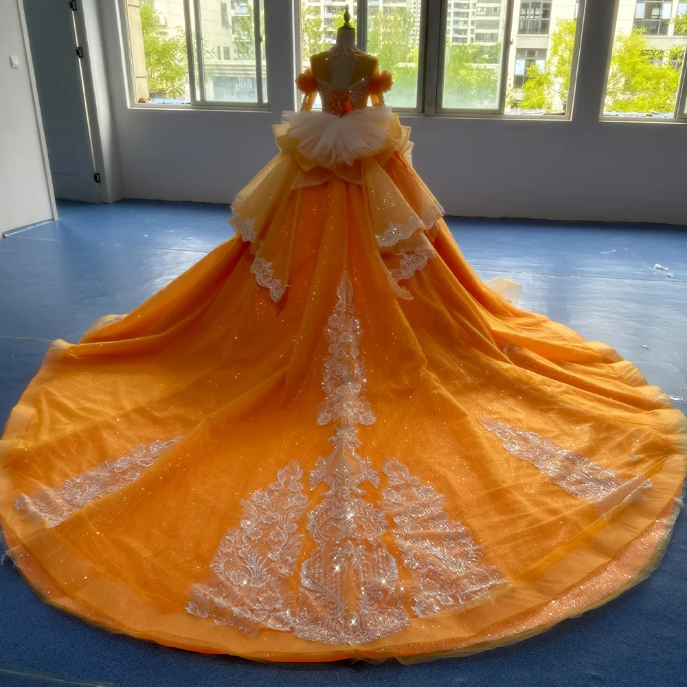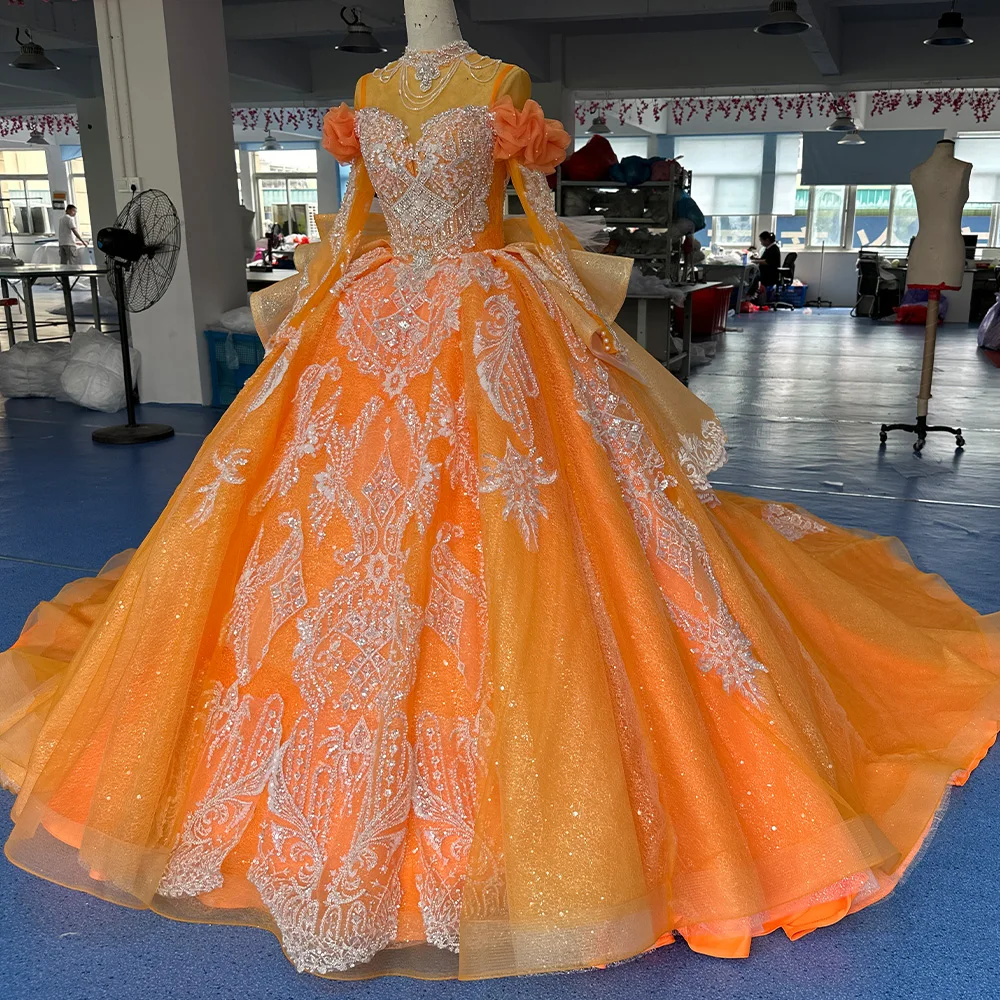 Beading Princess Orange Ball Gown High Neck Full Sleeve Church Wedding Lace Up