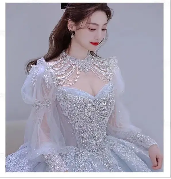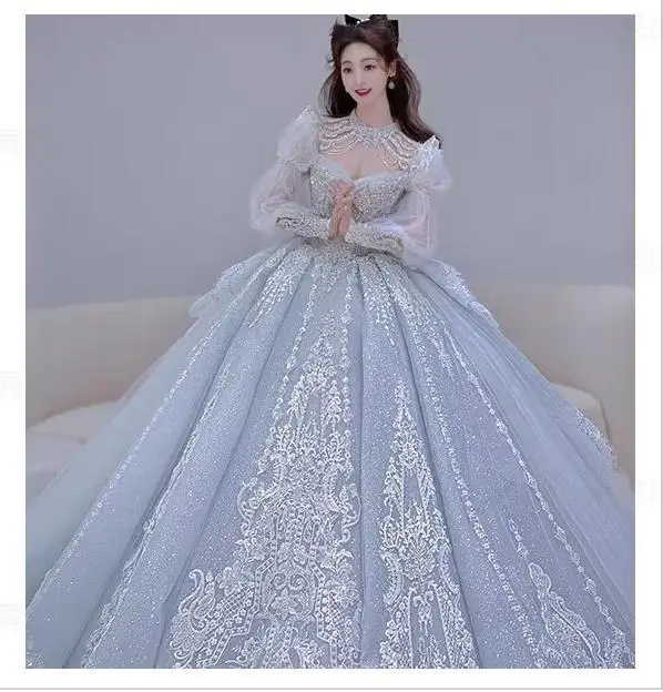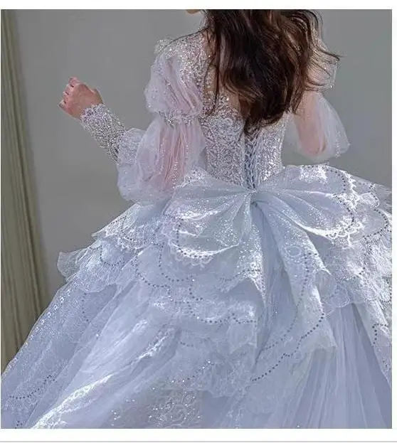 Long Sleeved Exquisite Shiny light blue Wedding Dress Embroidered Lace Sequined Vintage Bridal Gown With Bow And Beading